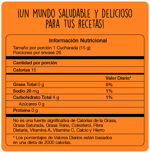 Ingredientes: Agua, edulcorantes (Maltitol – Sucralosa), espesantes (CMC, Goma Xantan), acidulante (ácido cítrico), sal, conservantes (Sorbato de potasio, benzoato de sodio), colorante (Color caramelo), sabor artificial idéntico al natural (Pancake).